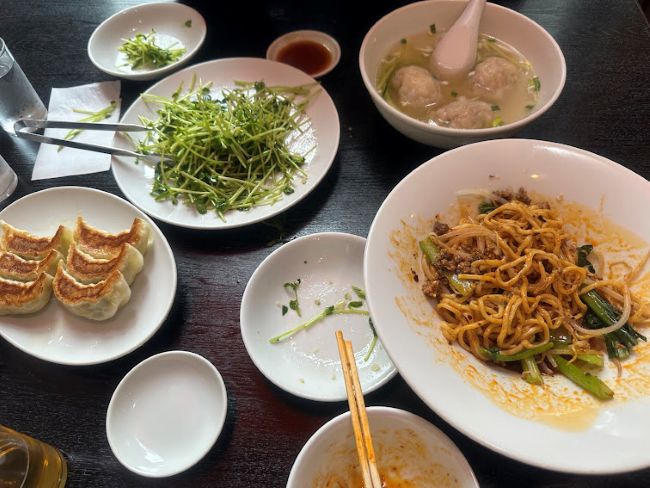 我们点了馄饨、煎饺、担担面,一瓶青岛啤酒,外加一盘炒豆苗。那碗担担面盛在盘中,是干拌的,不像我在重庆、成都吃到的那样汤红油亮。肉末间杂着青菜豆芽,却又麻又辣,是真正的川味——在异国他乡,这一口,胜过万千。