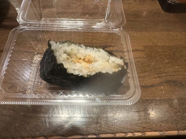 再来一杯札幌啤酒,外加两个日本饭团,一个包鱼,一个包肉。第一次吃日本饭团,有点像寿司的大型加强版:外裹深色紫菜,内是米饭与鱼肉蔬菜。好吃,又方便携带,颇为实用。