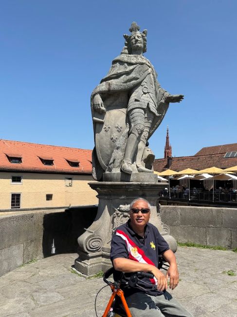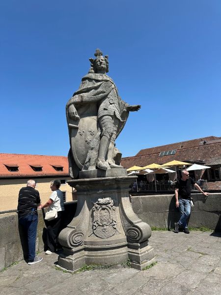 桥上最引人注目的,是那十二座巴洛克风格圣人雕像,描绘了乌兹堡历史上的关键人物。我身后的这位据说是“矮子丕平”(Pepin the Short)。