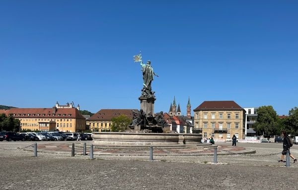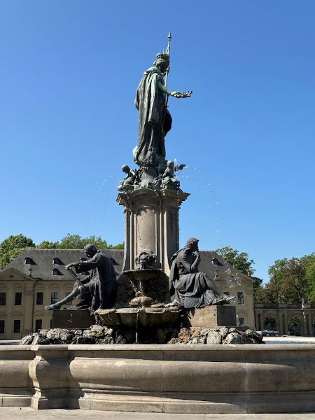 下一张照片带我来到四管喷泉(Four Tubes Fountain)。照片中,一个高耸的立柱,顶部矗立着象征性的雕像,周围有四根喷水管,象征弗兰肯地区的四条河流美因河、辛河、萨勒河和陶伯河,水流从雕塑中喷涌而出,在阳光下如银线般舞动。这座喷泉汇聚了四条河的象征,仿佛把整个弗兰肯的血脉都汇流进了这片闹市的心脏
