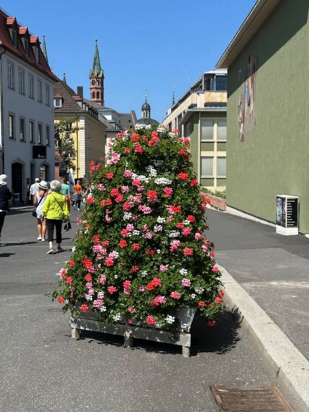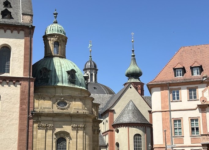 相册的下一章,翻开了乌兹堡老城(Altstadt)的照片。从皇宫不远处的小巷子开始。鹅卵石铺就的街道蜿蜒向前,两旁是粉色和米白色的巴洛克建筑,窗户上挂着盛开的花篮,偶尔有自行车铃声响起。乌兹堡的老城区不像大城市那样喧闹,它更像一个被时间遗忘的画卷,融合了中世纪的痕迹和18世纪的优雅。