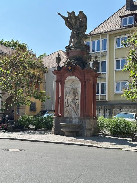 弗兰肯喷泉(Franconia Fountain)是一座充满浪漫气息的巴洛克喷泉。喷泉的核心是一个高大的女性雕像,头戴王冠,手持象征权力和丰饶的标志。她的基座四周环绕着三位雕像,他们是弗兰肯地区在文学、雕刻和绘画上的代表人物,象征弗兰肯文化的辉煌。