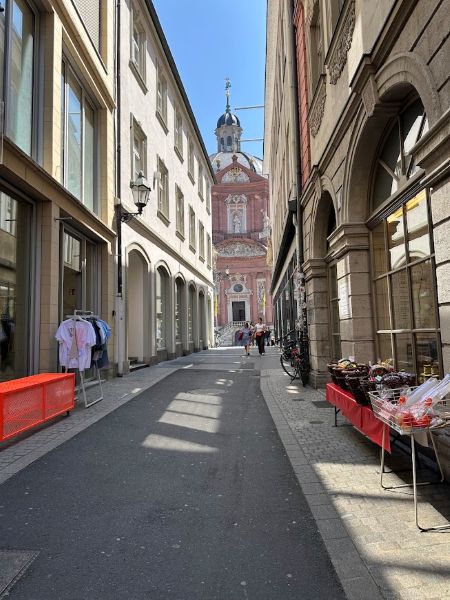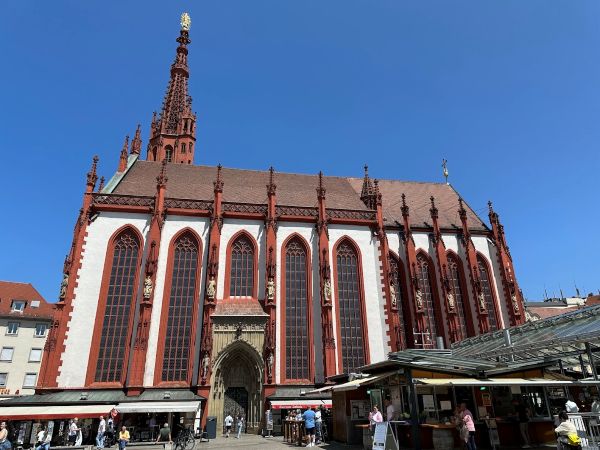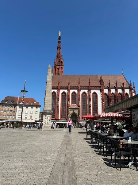 街边是小众精品店和咖啡馆,漫步其中,照片里偶尔闪现行人驻足品尝街头小吃,或在长椅上闲聊。这条巷子虽短,却连接着集市区(Marktplatz)的喧嚣,是闹市的前奏——从这里前行,甜蜜的诱惑和哥特尖顶很快映入眼帘。这里的魅力在于它的低调:不似广场的热闹,却藏着乌兹堡日常生活的诗意。