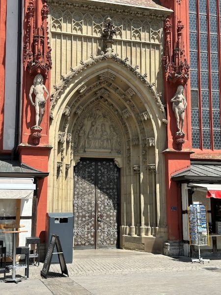 尽管名为“小教堂”,其实气势恢宏,是市民自建的信仰之所。正门的大拱券上布满哥特式雕饰,门楣浮雕描绘着《圣经》场景,庄重而神圣。门两侧的雕像最为引人注目:一边是亚当,一边是夏娃,象征人类的原罪与堕落。走近这扇厚重的铁门,仿佛能感受到中世纪市民虔诚的心声——跨过此门,便是从罪走向救赎的旅途。