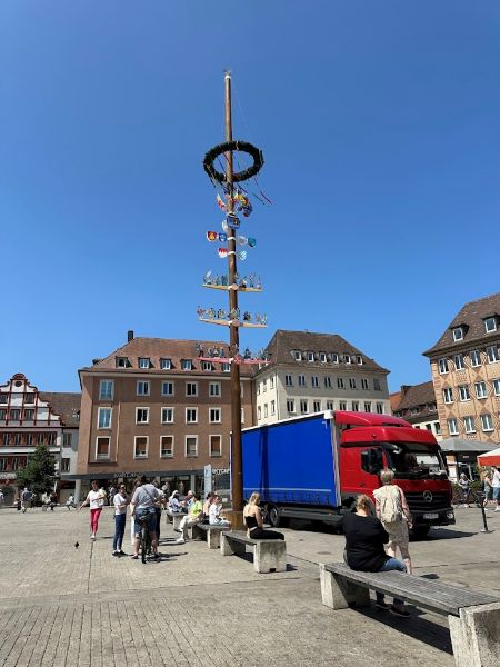 圣母教堂的前面宽阔的广场上,树立着一根高耸入云的木杆,顶部缠绕着绿色的花环(Kranz),下方挂满彩带、五颜六色的旗帜、盾牌徽章和小雕像群,正是巴伐利亚传统的五月树。
