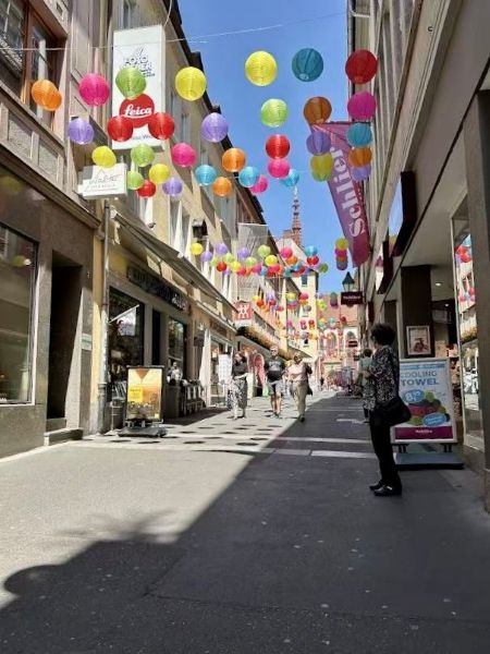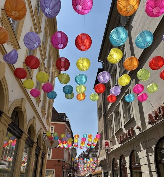 从集市广场的喧嚣中挤出来,拐个弯就撞上这条狭窄的巷弄,两旁是粉刷成暖色的巴洛克老屋,拱门下是精品店和咖啡馆橱窗,头顶那串串五彩缤纷的“气球”——其实是纸灯笼(lanterns),红的、黄的、紫的、蓝的,像一串串彩虹珠帘在蓝天下摇曳,行人们抬头拍照,空气中仿佛还飘着淡淡的节日香氛。这是乌兹堡老城区经典的季节性装饰,让整条街瞬间变身梦幻隧道。
