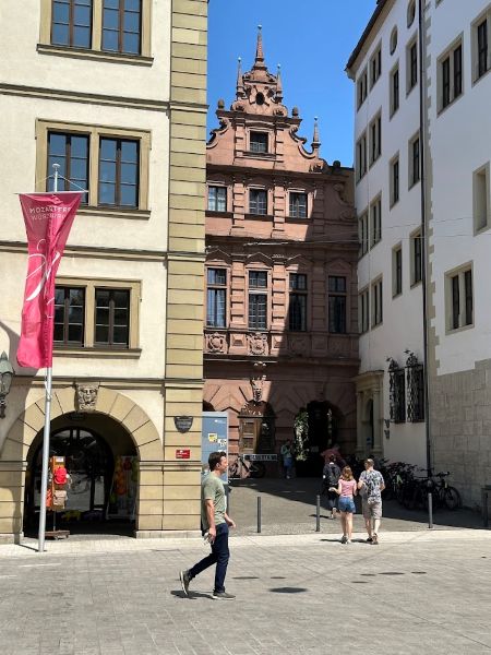 如果不是导游的提醒,有谁会注意到这个不起眼的建筑,凹进两边的建筑,就是一个跨越几个世纪的“拼图”建筑群。原来的哥特风格市政大厅,经过多次翻新和扩建,又融合了文艺复兴和巴洛克元素。照片中那粉红色的砂岩立面(典型弗兰肯风格),是17世纪晚期添加的“红楼”,门廊拱门和狮头雕饰散发着优雅的贵族气派,而尖顶塔楼则在1453年建成,是乌兹堡最早的钟塔,至今还能听到它悠扬的报时声。