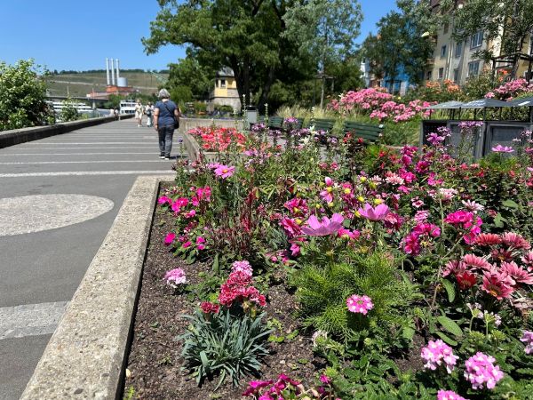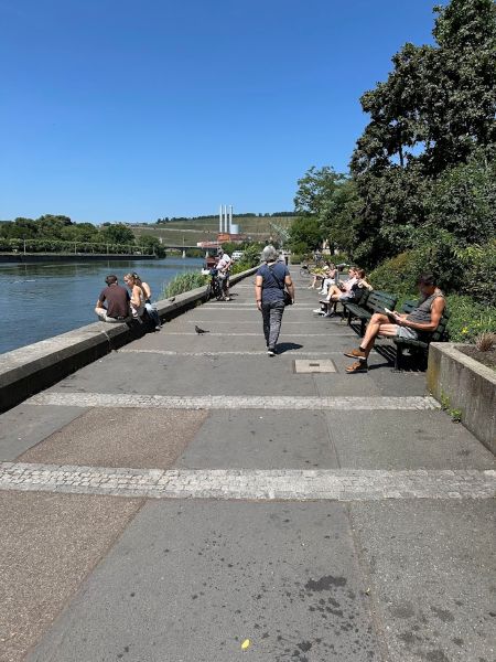 漫步河边,我拍下了流动河面:金光碎成波纹,桥影倒映其中,远处要塞的灯火渐起。步道上鲜花盛开,阳光下人们闲坐在步道边长椅和河岸的台阶上,或读书或休息聊天,好悠闲自在的乌兹堡人。