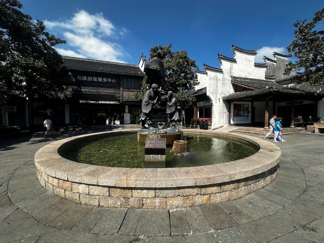 走近乌镇景区的大门,一轮圆形喷水池最先映入眼帘。池水清澈得近乎透明,仿佛刚从石缝里醒来。最有趣的,是那口立在中央的小小老式水井——水不是从喷头涌出,而像是从井心“娟娟冒起”,温吞中带着几分古意。若和我们那瓦蓝湖边随处可见的喷泉相比,它的气势确实“秀气”许多,却自有一份江南水乡独到的闲雅。