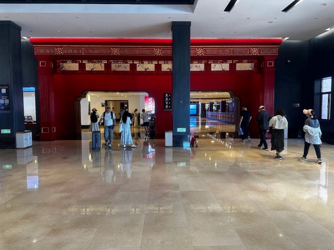 推门进入乌镇游客服务中心,迎面便是一片宽敞与明亮。黑色的方形立柱托着雪白的天花板,视觉上沉稳而利落;正中央那面亮红的装饰墙,则一下把人拉回到江南的文化质地上——墙檩上绘着梅兰竹菊,典雅又带着一点古意。两侧的廊门分别通往入口、卫生间和行李寄存处,路线清晰,也透着江南人做事的周到。