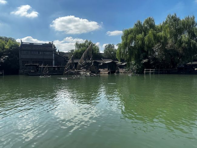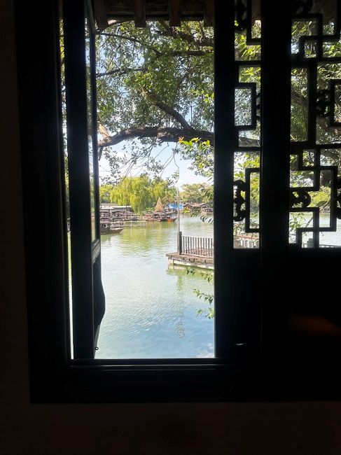 走进检票口后的第一眼,就是典型的江南:水光从建筑的窗轩间泄下来,蓝天在水面轻轻晃动,岸边的树影在风里婆娑。几艘游船停靠在码头边,静静等着一天的旅人。眼前这一幕,竟让人想起那句古意盎然的诗——“门泊东吴万里船。”