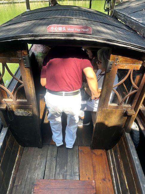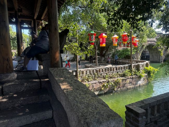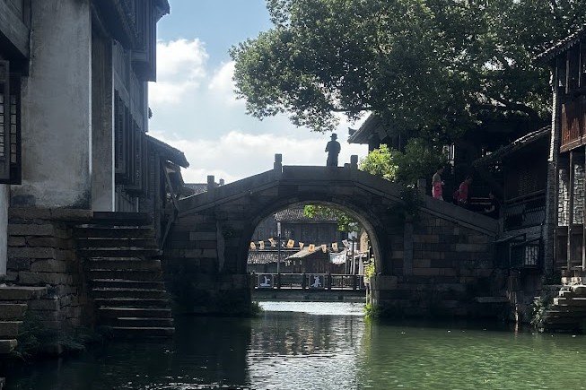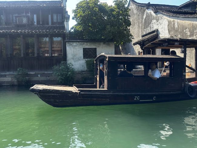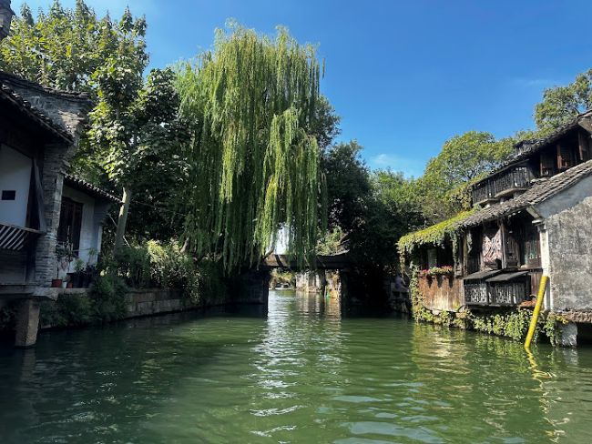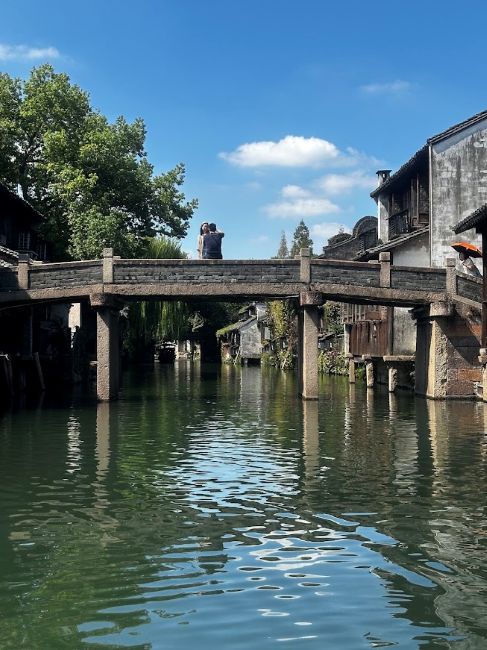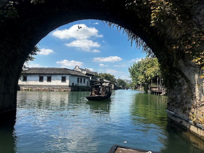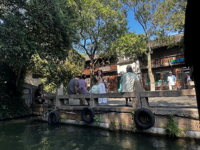 我们沿着来时的河岸往回走,远远看见码头上停着几艘空着的小乌篷船。船工远远冲我们招手,仿佛早就知道我们会“投降”。这次是逆着上午的方向摇回去。阳光已西斜,光影颠倒,桥洞里的暗处更暗,水面的亮处更亮。船行到中段,风突然大了,船身微微晃,大家都不说话,只听见橹声欸乃,水声潺潺,还有远处偶尔飘来的一句吴侬软语。