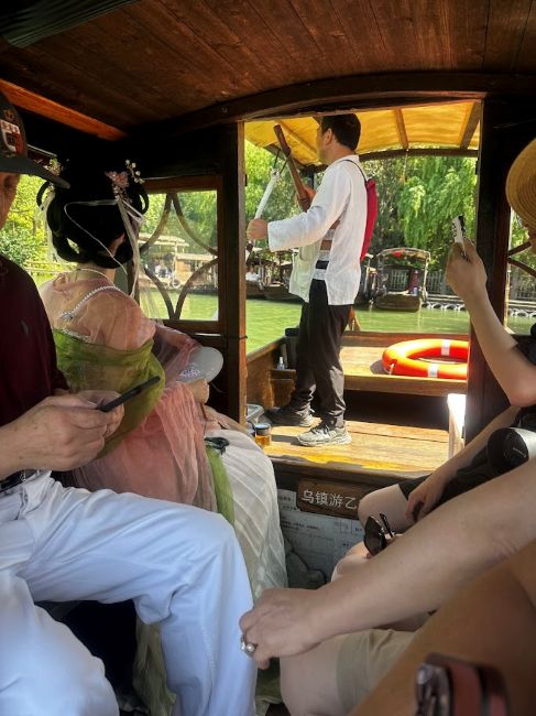 “欸乃一声山水绿”。船工摇动木橹,一声水响划破宁静,小船悠悠,正式开启了我们的乌镇水上游之旅。