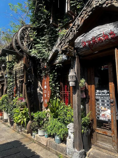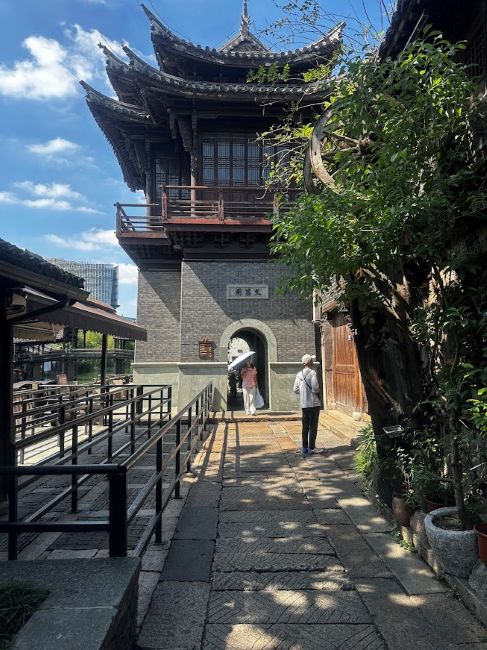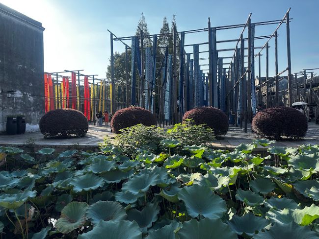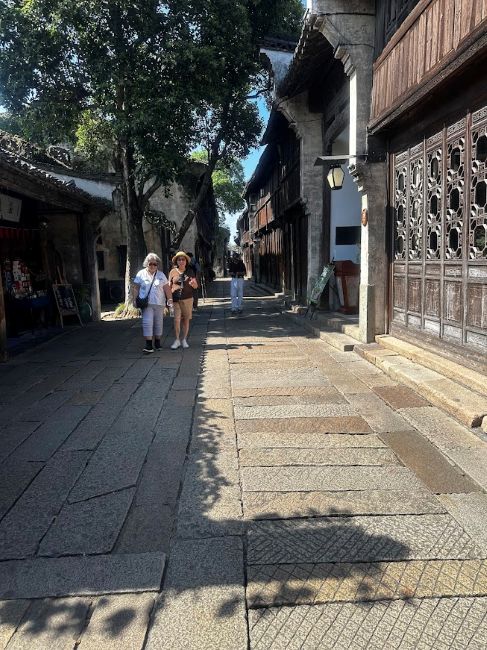 沿石板路徐行,两旁是岁月的见证——木制老宅静静伫立,泛黄的木纹里沉淀着时光。这些老建筑如今焕发新生,化作各色店铺:飘着茶香的茶室、洋溢着现代气息的咖啡店、地道的水乡餐馆,以及挂着蓝印花布招牌的民宿客栈。