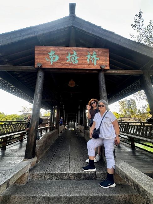 自文昌阁信步不远,便到了那座别具一格的南塘桥。它与我们之前见过的所有小石桥都不同——厚重的黛瓦为它覆上了一顶完整的屋顶,如同一座横跨水面的小小厅堂,为往来的行人遮风挡雨。走在桥内,光线透过木格窗棂柔和地洒下,瞬间隔开了外界的喧嚣。桥下流水潺潺,桥上的人却可安然立于一片阴凉与静谧之中,这份体贴入微的关怀,让这座桥不止是路,更成了旅途中可以暂歇身心的驿站。