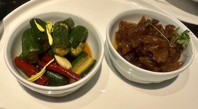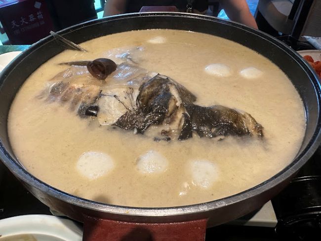 鸡蛋煎饼卷得金黄,边缘微焦,咬下去“咔嚓”一声脆响,蛋香混着葱花,一口下去,满桌江南菜瞬间有了烟火气的底座。凉拌黄瓜敲得碎碎的,酸辣爽口;卤牛筋软糯入味,咬不断的那种韧劲,像在和牙齿开玩笑;砂锅鱼头汤奶白奶白的,鱼腥味一点没有,只剩豆腐和粉丝在汤里幸福地翻滚。