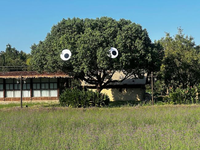 最奇特的是田边一棵老樟树,树干上安装了两个白底黑心的圆圈,像极了一双温和的眼睛。好像还利用太阳能的能源,黑色眼瞳会追着行人转动。当地人叫它“树的眼睛”。站在树下抬头,感觉它在静静看你,好像看穿了你所有的来历和去向,却什么也不说,只把几片叶子轻轻落在你肩头,算是打过招呼了。