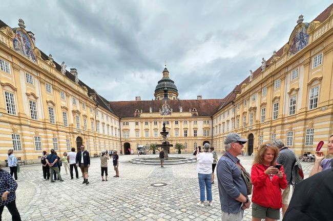 中午时分,邮轮缓缓靠岸,梅尔克的修道院在薄雾中若隐若现,宛如一座金色的梦境。阳光初透,瓦豪河谷之旅迎来了高潮,这座巴洛克杰作将我的内心彻底点燃。