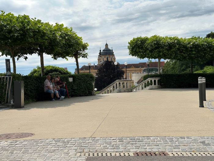 修道院下方,巴洛克花园(Barockgarten)如一幅精致的画卷展开,设计融合了对称花坛、几何形状园艺和壮丽喷泉,背景是修道院的辉煌建筑,典雅与奢华交织,令人叹为观止。