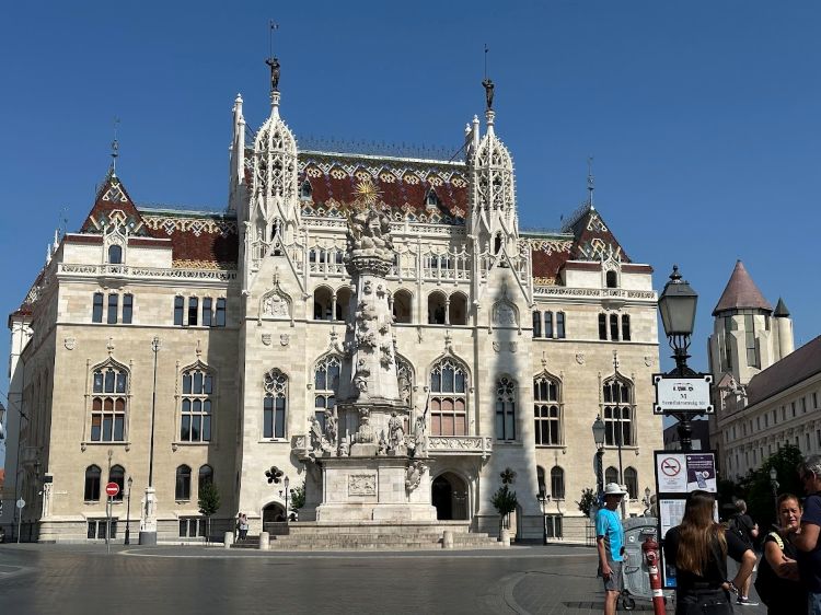 上山途中,首先映入眼帘的是三位一体广场(Holy Trinity Square)上的圣三位一体柱,高耸洁白,由巴洛克式雕刻构成,顶部是圣灵与基督的象征。它原为1713年为纪念瘟疫终结所立,表达人们对上天的感恩。据匈牙利历史学家估计,1710至1713年间的瘟疫导致全国死亡人数高达二十至二十五万。这种瘟疫纪念柱在欧洲中部(如奥地利、匈牙利、捷克等地)巴洛克时期非常常见,象征信仰与救赎。