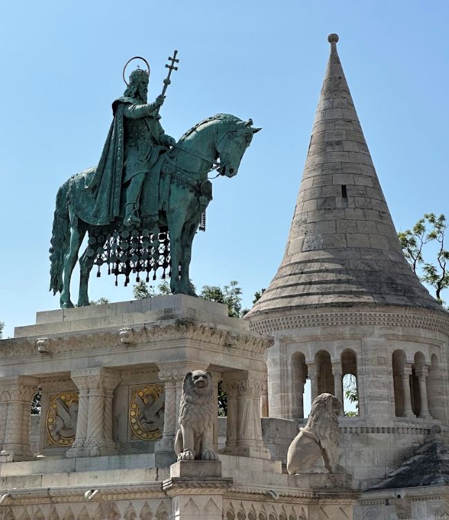 教堂一侧广场,矗立着一尊威严的骑马铜像,是匈牙利国王圣伊什特万(St. Stephen I)的塑像。他身披披风,手持权杖,座下骏马仿佛跨过了整个喀尔巴阡盆地。