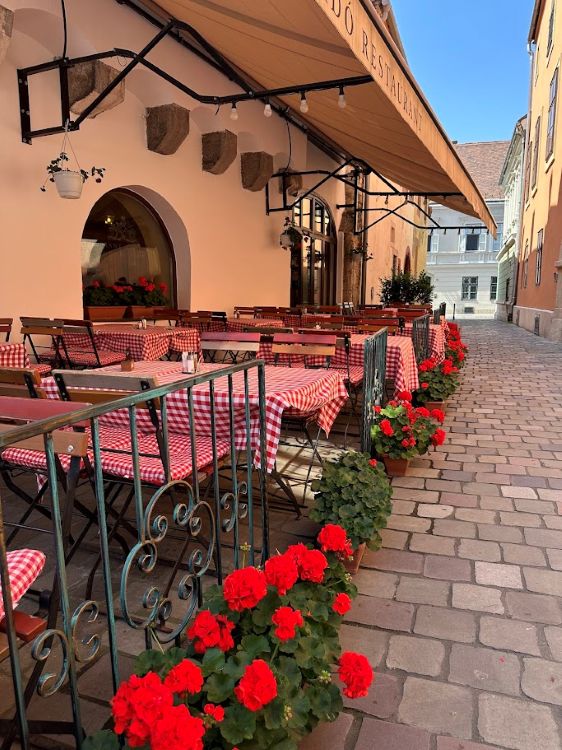 推着手推车顺着山坡而下,在一处小酒馆停了下来。露天的桌椅边一团团红艳艳的花,吸引了我的目光,也仿佛温柔地挽住了疲惫的双腿。上山的一段路,让我推车的腰腿更加酸痛。来一杯冷饮,不仅清凉解渴,也正好歇脚恢复,稍稍抚平一路攀登的疲惫。虽然布达城堡山可上可不上,但是时间还早,何不乘此机会过去看看?