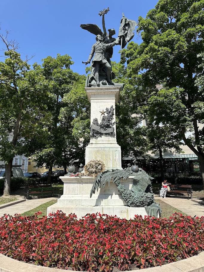不远处,花丛中矗立着一个纪念碑,碑顶的青铜雕塑由两位人物构成:前方是执刀战士,背后则是展翼高举桂冠的自由女神,她右手挥舞旗帜,仿佛在召唤自由。雕像脚下环绕青铜花环。走至近前,方知是独立战争纪念碑(Statue of the Independence War),纪念1848年匈牙利人民为民族独立奋起抗争的英勇时刻。