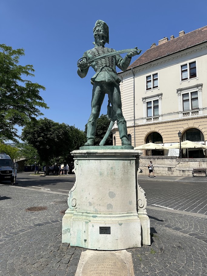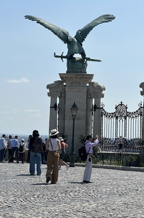 总统府宫墙之侧与王宫花园之间的平台边缘,一只展翅高张的巨鹰铜塑,利爪紧握一柄长剑,站立在高高的基座上,鹰喙微张、眼神凌厉、朝向东方(佩斯)。这并非现实中的鹰,而是图鲁尔(Turul),匈牙利民族神话中的神鸟。它讲述着一个古老游牧民族如何从草原迁徙至喀尔巴阡盆地,建立国家,并誓死守护这片土地的决心。