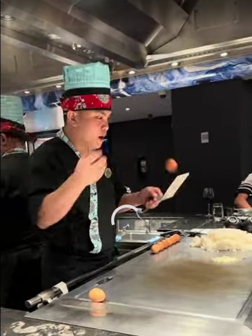 傍晚的邮轮餐厅里,预约成功的我们终于坐进了那家免费的铁板烧餐厅。厨师是一位菲律宾人,精力十足。随着他高高抛起鸡蛋,又在空中精准接住,铲面猛地一拍,一道火焰腾空而起——“这叫火山爆发!”他笑着说,周围响起一片掌声。