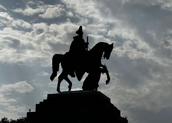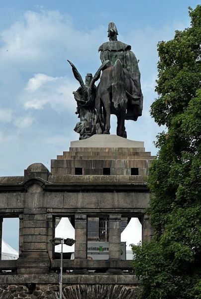好在上次匆匆路过时,已见过正面全貌。这座纪念碑缅怀威廉一世(1797-1888),德意志帝国的首位皇帝。威廉一世领导普鲁士在1871年普法战争后统一德国,结束诸侯割据的乱世,他被塑造成民族英雄:雕像中,他身着华丽军装,手持指挥棒,目光坚定,身后胜利女神张翼翱翔,象征统一与征服的辉煌。设计师雕塑家与建筑师联手打造,高达37米的整体结构包括14米高的基座和皇帝骑马铜像,重达14吨。基座上铭文与浮雕如史诗般展开:从普鲁士崛起,到凡尔赛大厅的帝国宣告,每一刀凿痕都刻着国家叙事。铜材的选择,更是帝国自信的体现——坚韧、闪耀。