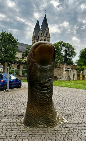 科布伦茨这一尊特别强调触觉的亲密——指腹的山峦般褶皱层层叠嶂,指缝宽阔如峡谷,邀请游客从基座钻入“缝隙”中自拍,玩一场规模失调的捉迷藏游戏。在骑士团的灰墙前,它隐喻着“触摸历史”的原始冲动,从中世纪的铁拳征服,到现代的柔指探索,时空在这里悄然弯折成一个亲切的拥抱。