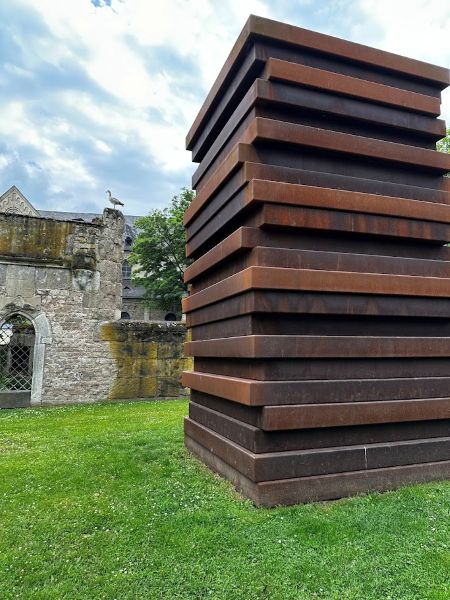 高约4.4米、重达11吨的“金属砖塔”矗立在草坪上,矩形钢板垂直堆砌如抽象的积木塔或现代版的巴别塔,表面氧化成温暖的锈色,散发着工业却诗意的芬芳。背景哥特式拱门与苔痕斑斑的石墙,一只意外的白鹭优雅驻足墙头,添了份自然的野生惊喜——2025年6月的莱茵河畔,云层低垂下,钢板的边缘投射出动态的阴影错觉,邀请游客从多角度体验空间的深度与光影变幻,仿佛每一层堆叠都藏着情感的秘密。
