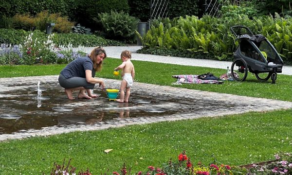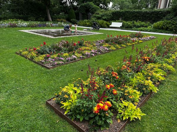 庭院深处,便是博物馆的正式花园(Paradise Garden),一个精心设计的绿洲,融合中世纪修道院风格与当代艺术的轻盈。对称的花坛盛开象征圣母玛利亚的玫瑰、百合与薰衣草,白色长椅环绕小喷泉,绿篱与树木营造出“伊甸园”的宁静意象——设计灵感源于中世纪的玛利亚花园,象征纯净与重生。浅浅的喷泉池边,一个年轻妈妈蹲身,温柔递水桶给蹒跚学步的宝宝:小家伙光着脚丫、裹着尿布,兴奋踩踏水花溅起,咯咯笑声回荡在拱门间。