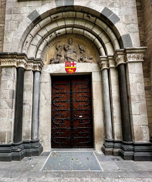西门入口的“叙事浮雕”更如一出石刻戏剧:拱顶的顶雕描绘基督坐在宝座上,手持书卷,周遭门徒与野兽环绕,象征末日审判与救赎的永恒主题;门楣下的纹章是科布伦茨市徽——红底十字狮子,源自中世纪条顿骑士团的精神堡垒,他们曾以此教堂为据点,策划东征。