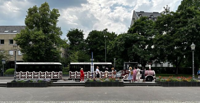从Basilica of St. Castor的钟影中走出,推着手推车,教堂外头的鹅卵石广场忽然活络起来:一列复古风的观光小火车“Altstadtexpress Koblenz”停在路边,电动拖车头拉着彩绘车厢,车身印着醒目的“Altstadtexpress”字样,专为游客设计,环绕老城区慢悠悠转一圈,约30-40分钟一趟。