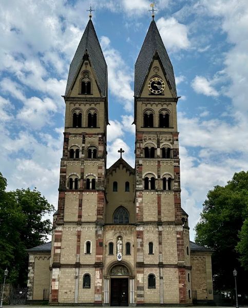 灵感源于意大利比萨大教堂,却融入了莱茵地区的本地石材,厚重而亲切。云朵下,金色十字顶饰闪耀,苔痕与风化纹理如岁月的亲笔签名,从神圣罗马帝国的选举殿堂,到二战炮火的洗礼,它顽强矗立,守护河谷的灵魂。推车停在草坪,我仰头凝视,仿佛偷窥中世纪的祈祷仪式,风中隐约传来钟鸣的余韵。