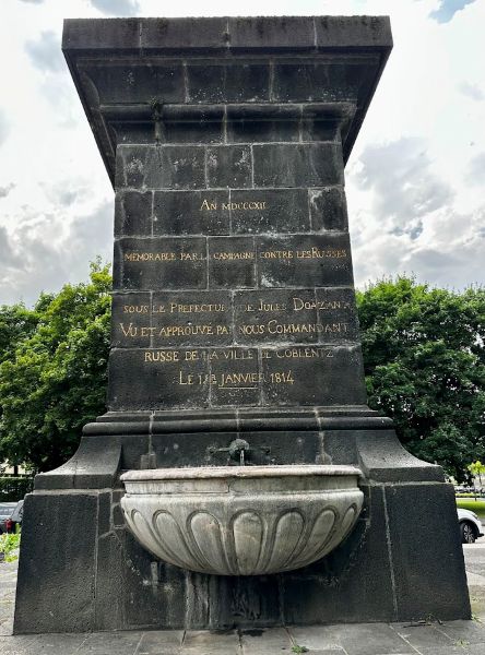 1812年,法国占领下的科布伦茨市长下令建造,本意庆祝拿破仑的俄罗斯战役“大捷”——尽管那场莫斯科远征实为惨败,法军冻饿无数,退军如潮。喷泉顶部原本饰以法国鹰徽,铭文吹嘘“对俄罗斯的胜利”,满是帝国妄想。