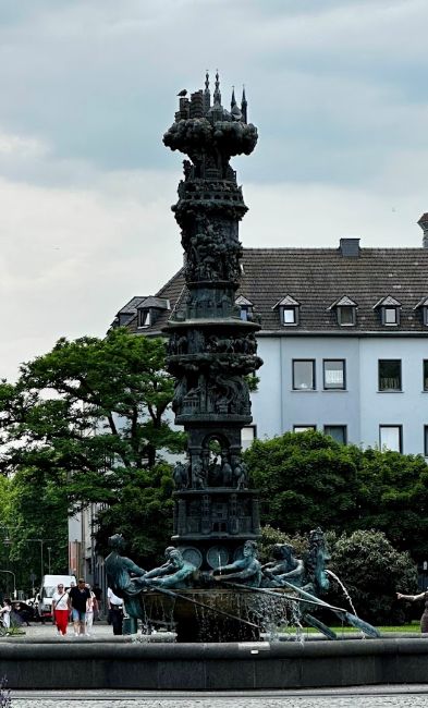 从小火车的汽笛与喷泉的低语中抽身,推着手推车穿梭鹅卵石小巷,空气中多了一丝巷弄的幽闭芬芳。两步之外,便是戈雷斯广场(Görresplatz),那里矗立着一座约10米高的青铜塔状喷泉——“历史柱”,或称“历史喷泉”(Geschichtssäule)。