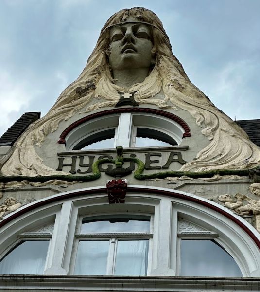 从历史柱广场右拐,钻进一条狭窄的鹅卵石小巷,抬头惊喜撞上:一位金色浮雕的女性头像,正是希腊神话中的“许癸亚”(Hygeia),健康与卫生的女神。