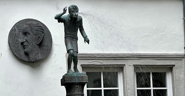“Schängel”是当地方言,源自中世纪的“Schelm”(小恶作剧者),代表莱茵河谷的顽皮孩童形象。当年铸造时,本是市政厅的供水设施,拿破仑时代后,城市开始重视公共卫生,转为街头饮水点。小男孩的姿势藏着传说:一种说法是调皮学徒偷喝酒窖的美酒,被抓时还“吐”出一口,象征“酒后真言”的莱茵幽默;导游给我们讲的另一版本,则是中世纪反抗校园霸凌的孩子,他口里喷出“怒水”反击——原来,持强凌弱的戏码古已有之,不仅成人世界,孩童间亦然,那份石头般的顽强反抗,让人心生共鸣。