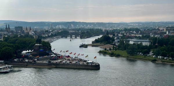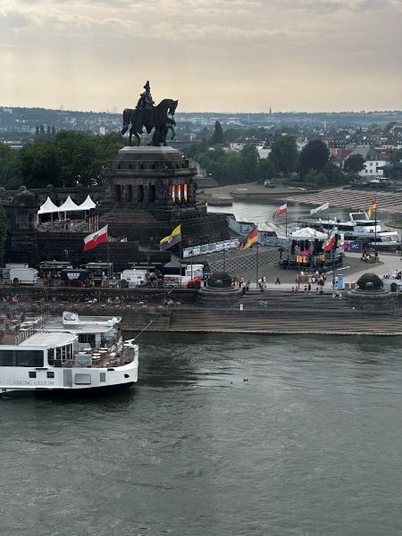 准时登上缆车,携推车入舱,低头俯瞰,宽阔的莱茵河如银带蜿蜒,德国角的威廉一世骑马雕像遥遥在望,身后堡垒如守护神般俯瞰河谷。河上停满邮轮(我们的那艘在左下角轻轻摇曳),岸边帐篷与德国旗帜林立,看似节日赶集或夏季Rhine in Flames烟火节的余韵。