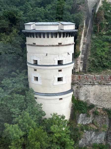 首先是白色塔楼(Weißer Turm),孤立圆形,高约20米,灰白石材外墙布满狭窄射击孔(方形开口设计用于火炮防御),顶部平台曾架设瞭望仪,监控河上船只。从缆车视角,它像“堡垒的眼睛”,矗立山坡中段,连接下站的500级石阶(若腿脚利索,可步行而上)。历史中,它见证拿破仑战争后的重建:法国人1814年炸毁旧堡,普鲁士用更坚固的白石重筑,确保“永不陷落”。如今,它是游客的第一道关卡,登塔后能近距离摸摸风化的炮眼,感受冷战时期的回音(堡垒曾是美军基地),推车绕行时,那份厚重如山的压迫感,混着夕阳的金暖。