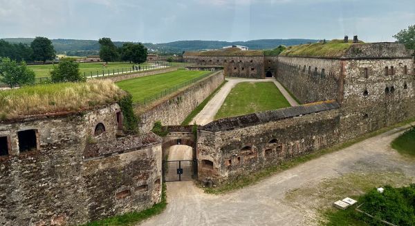 坡顶的黄色营房Gelbe Kaserne,则是19世纪普鲁士兵营区:浅黄墙壁的平房与多层楼,拱窗与阳台错落,建于1820年代,原为士兵宿舍与军官居所,能容纳上千人,内部有食堂、马厩与地堡系统。从空中看,它们像“堡垒的肺腑”,嵌入绿坡中,颜色源于本地砂岩涂料,象征普鲁士的“金色荣耀”。拿破仑时代,这里曾是法国军营,普鲁士重建时加固了防御。今天,这些营房改建成文化中心与青年旅舍,夏天常办音乐节,里面咖啡馆飘出香气,边喝咖啡边赏河景——仿佛听到昔日军鼓的余韵。