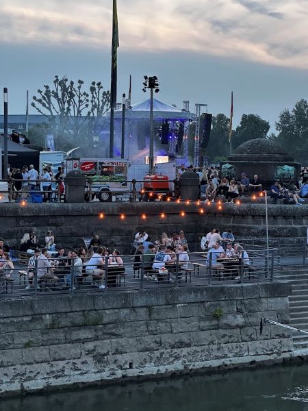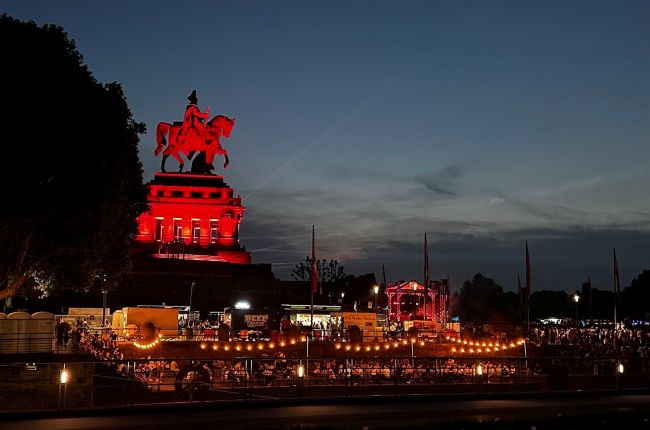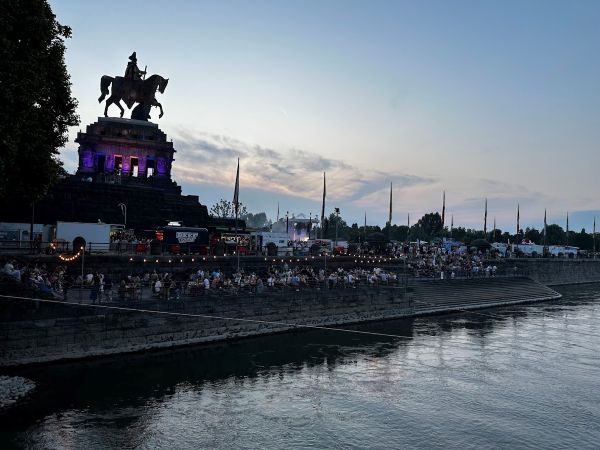 平日里,这里是安静的河畔散步道,鸽子在雕像脚下悠闲踱步,邮轮乘客偶尔驻足合影;但今晚这个周六,它化身为狂欢的海洋!原来是城市的音乐酒会(Koblenz Wine Festival),河边露天餐馆挤满游客与本地居民,桌椅外溢到石阶上,空气中混杂着烤香肠的烟火气与葡萄酒的果香。广场上帐篷林立,LED灯串闪烁如星河,主舞台的音浪滚滚而来:压轴是电子音乐酒节,DJ的bass如心跳般低沉有力。