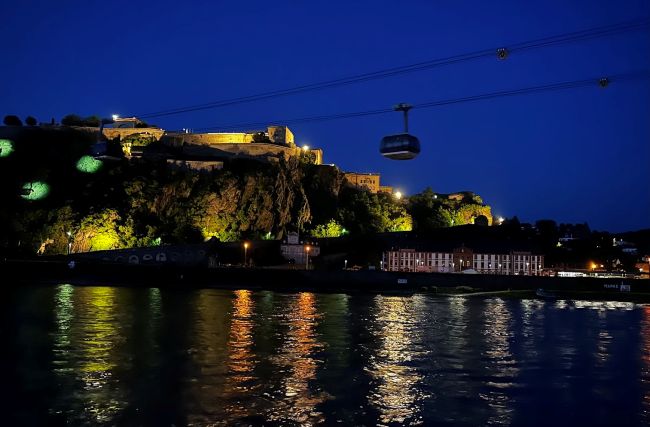 堡垒的影子拉长在水面,石墙上投影的彩光勾勒出中世纪轮廓,河水如镜面折射游船的霓虹,莱茵与摩泽尔在夜色中“燃烧”——这不只是灯光秀,更是历史的低语与当下的拥抱。