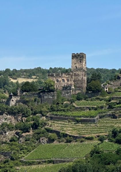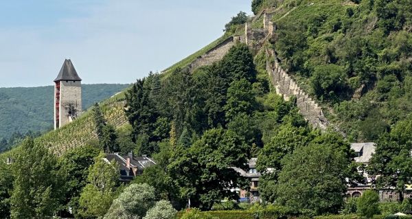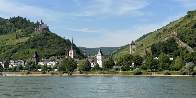 两岸青山叠翠,密密麻麻的葡萄园如同绿色的挂毯,从山顶一直铺到河边。而在这片绿意中,一座座城堡与废墟,像被时光遗忘的骑士,镇守着每一个山头。山脚下,彩色积木般的房子簇拥着尖顶教堂,倒映在沉静的河水中。