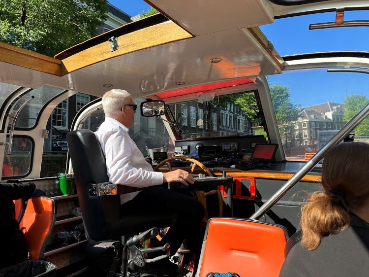 运河游继续前行,船经过新市场(Nieuwmarkt)附近的一道小型水闸。许多人不知道,整个阿姆斯特丹其实是建在沼泽地上的。这座城市能安然屹立数百年,依赖的正是一整套精妙的水利系统。水闸与堤坝协同运作,控制水位、避免洪灾,至今仍每日运行。