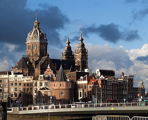 站在桥上眺望远方,尼古拉斯大教堂(Basilica of Saint Nicholas)高耸而立,庄严静穆。教堂建于19世纪末,以圣尼古拉斯为名——这位水手的守护神,也反映了阿姆斯特丹作为港口城市的历史印记。建筑风格融合了巴洛克与新文艺复兴,穹顶高耸、彩绘玻璃熠熠生辉,尤其在夜晚灯光映衬下,格外壮丽。