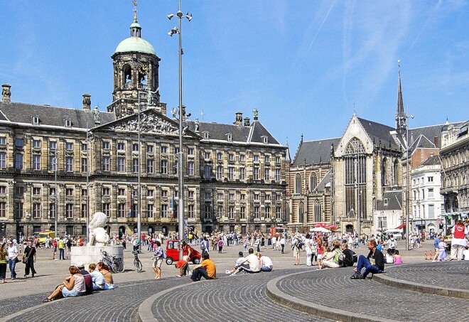 周边最显眼的是王宫(Koninklijk Paleis),建于17世纪,体现荷兰“黄金时代”的建筑风貌。王宫建于河床之上,依靠13,659根木桩支撑,象征这座“水上城市”的非凡工程技术。如今仍为荷兰王室接待贵宾之所。