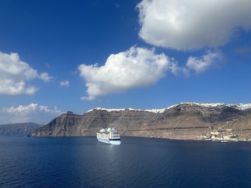 以前,我经常在一些杂志和风景照上都“见过”这个地方的风景。不知道此生有没有机会到此一游。没有想到,今天早上,圣托里尼就出现在游轮前方。感恩!